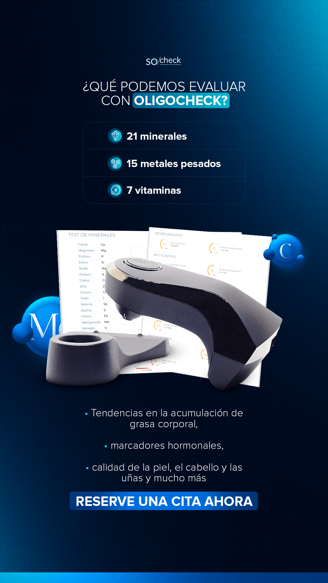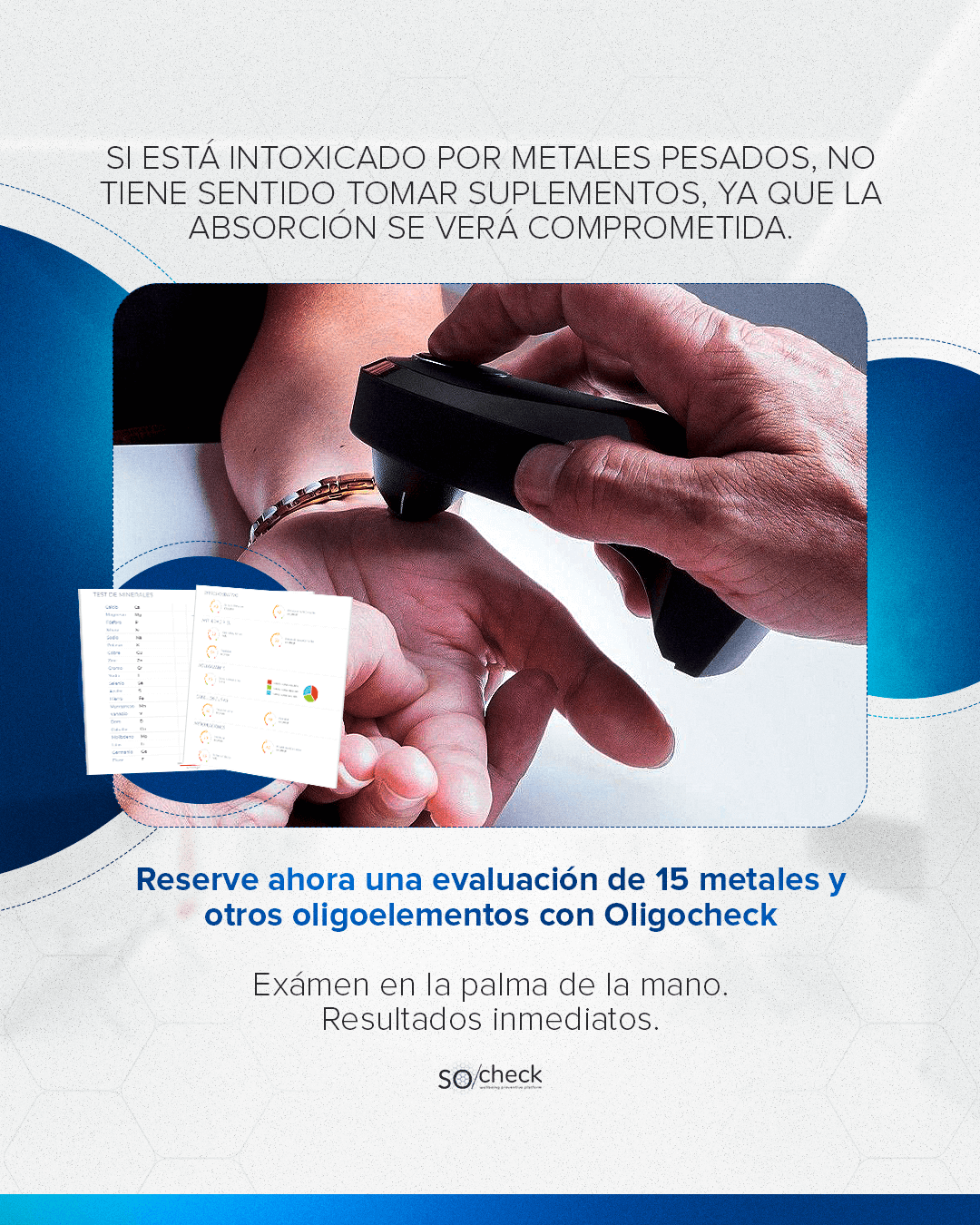 OligoCheck es un análisis rápido, no invasivo y altamente tecnológico que evalúa en minutos los niveles de minerales, oligoelementos, metales pesados y estrés oxidativo en tu cuerpo, a través de un escaneo realizado con bioespectrofotometría.